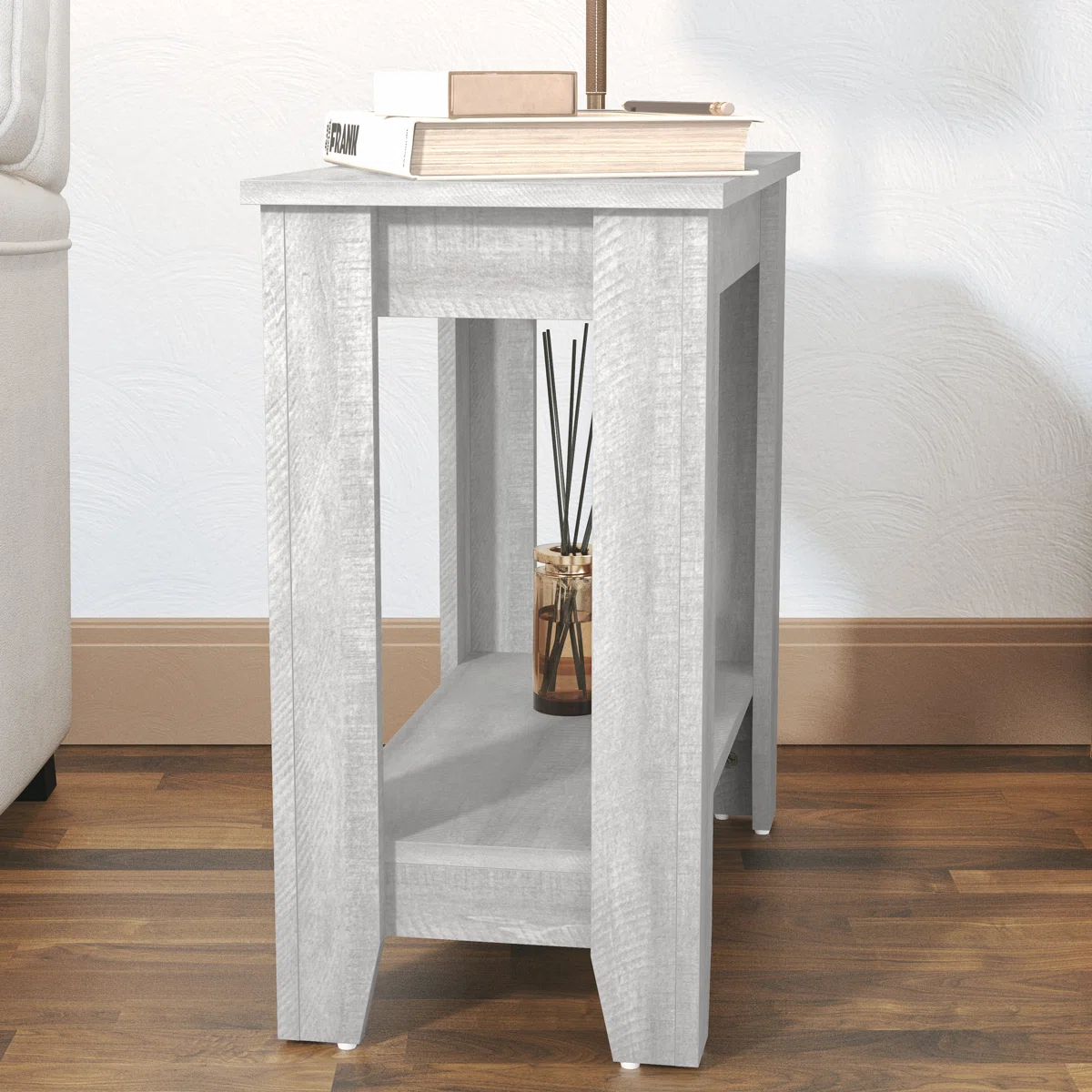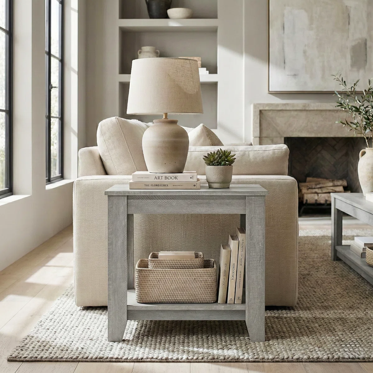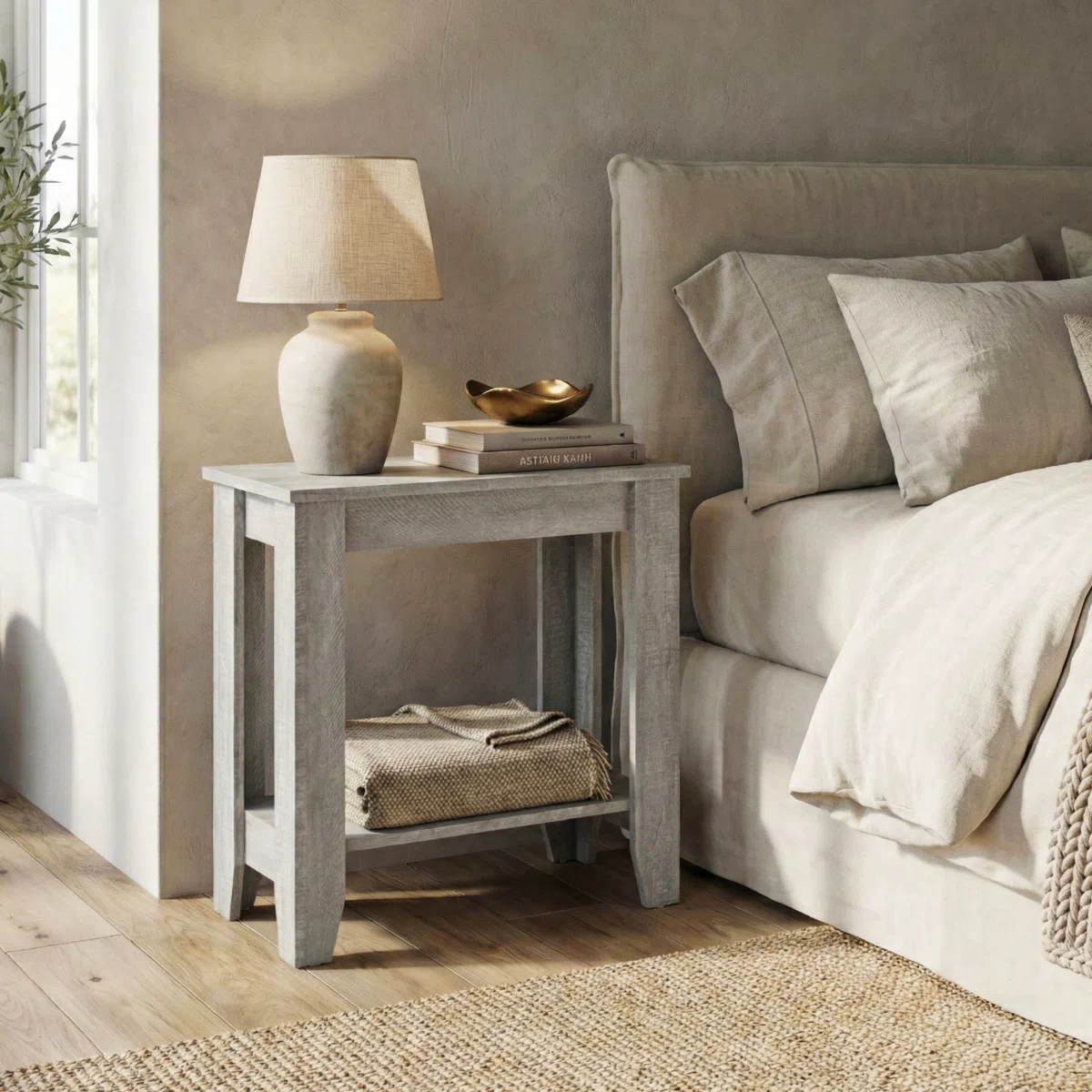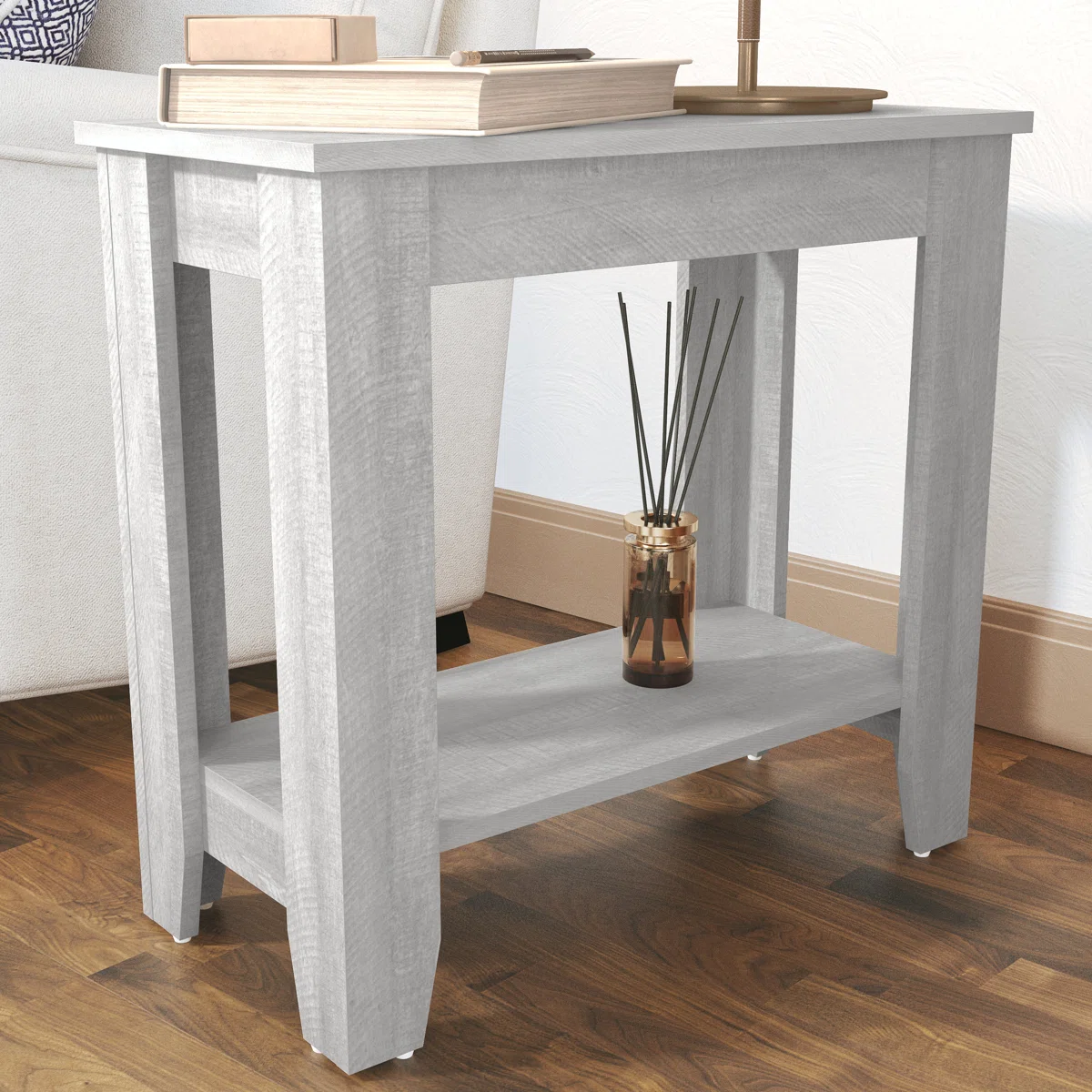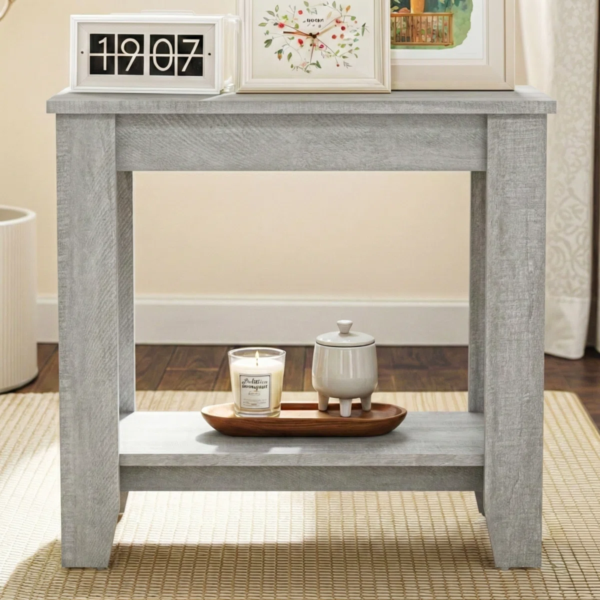 🌊 Coastal Farmhouse Charm: Beautiful weathered grey finish that adds a touch of rustic, relaxed elegance to any room. 📚 2-Tier Storage: Features a spacious top for your lamp and coffee, plus a lower open shelf for books, baskets, or decor. 📐 Compact & Versatile: The perfect space-saving design to use as a sofa side table, nightstand, or accent piece. 🛠️ Sturdy & Durable: Built with a robust frame and tapered legs for long-lasting stability.