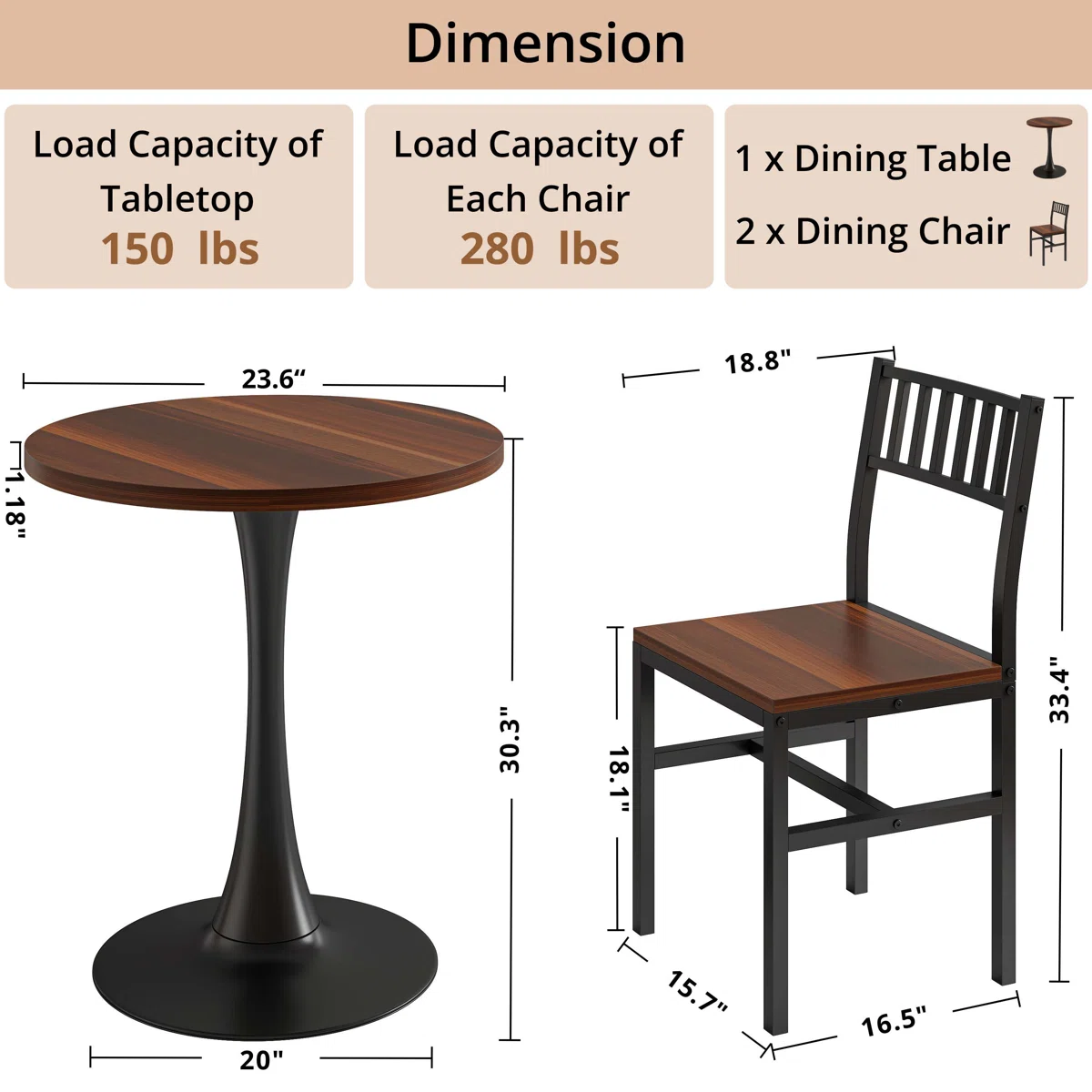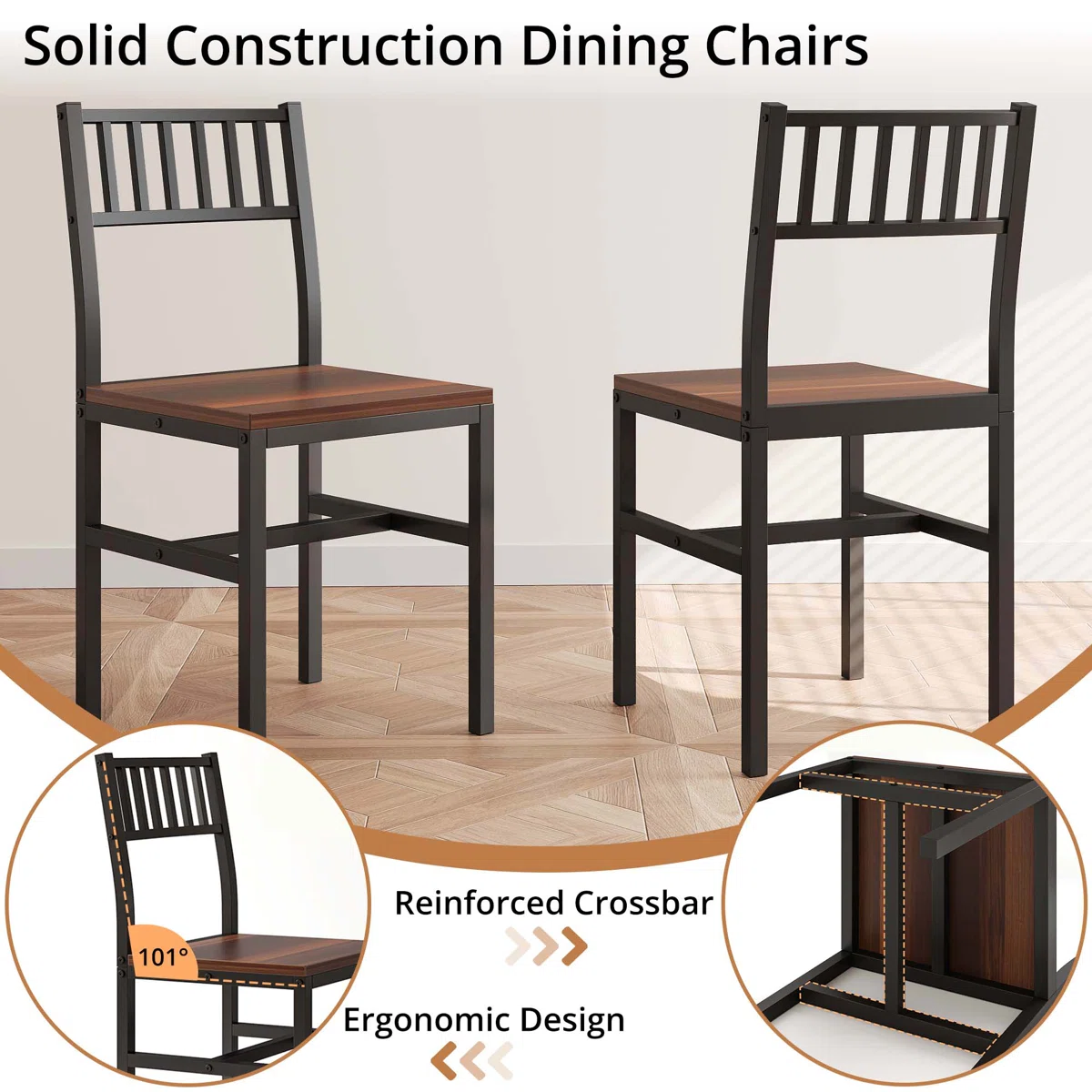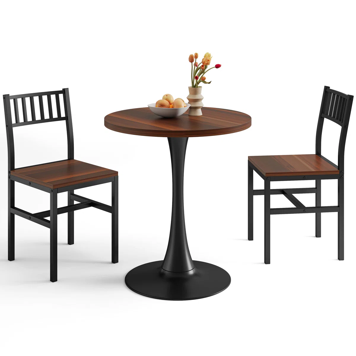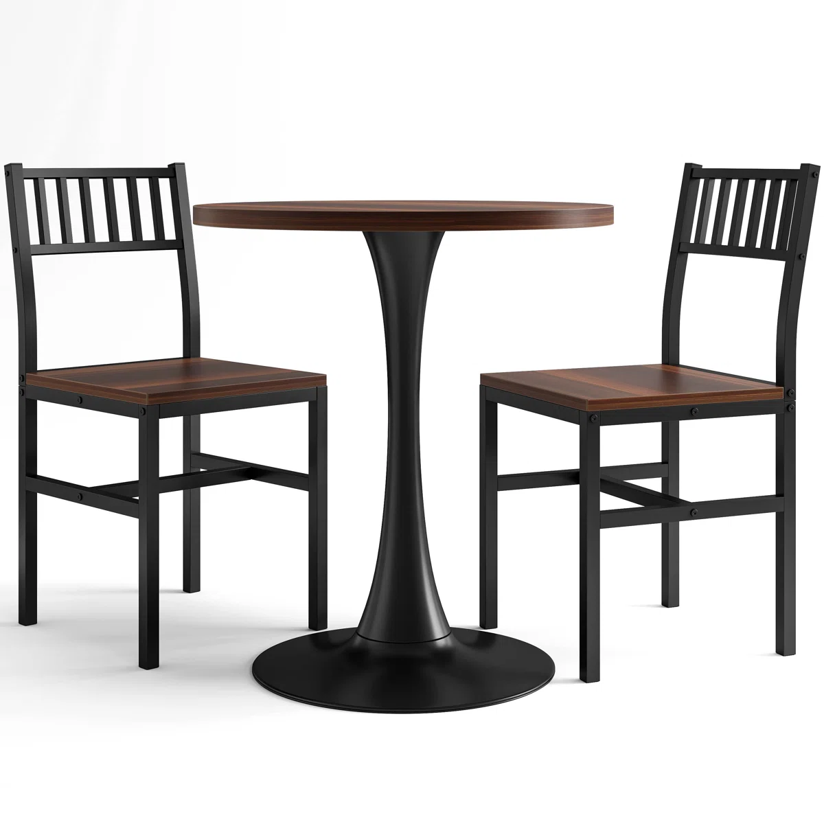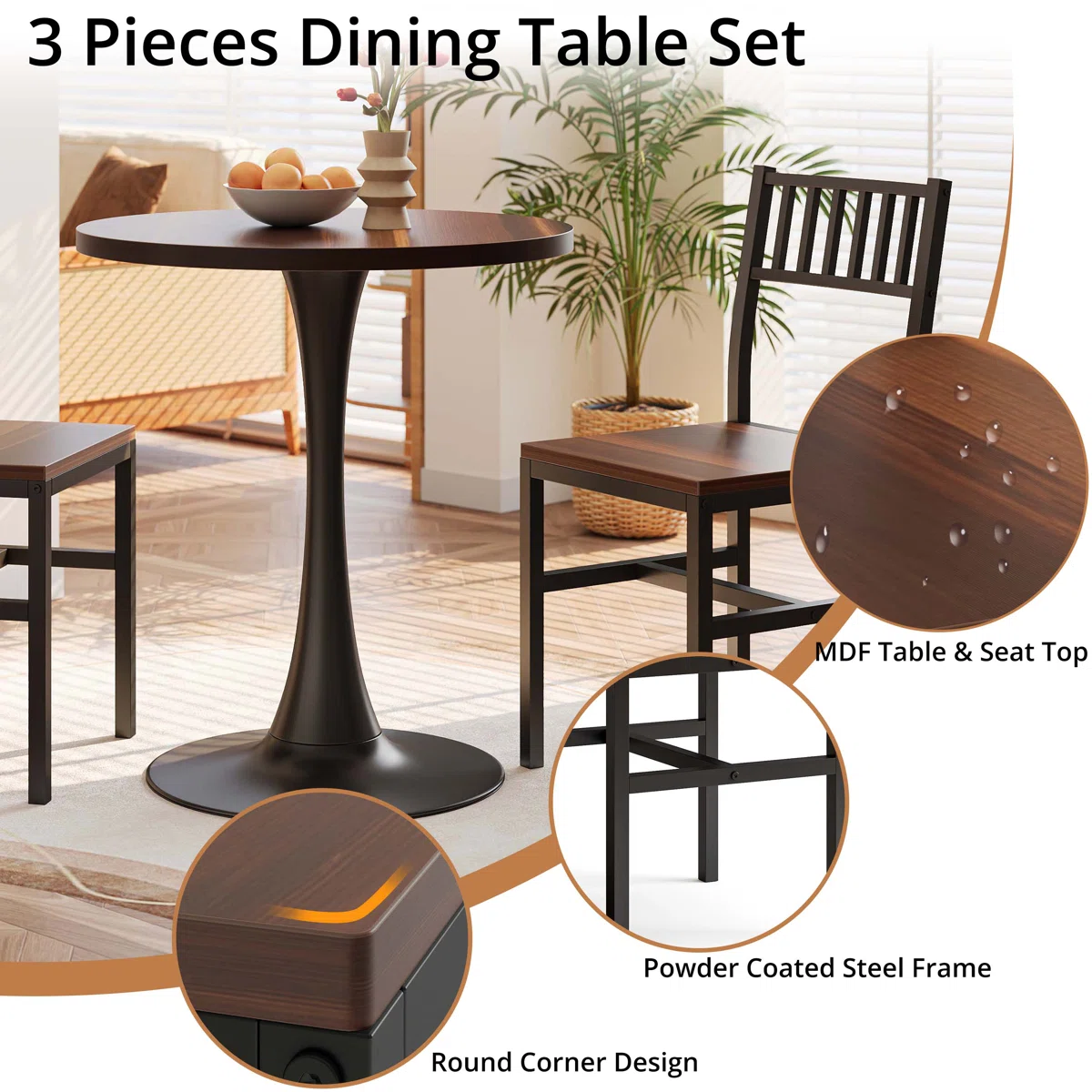 - Industrial Meets Warmth: The rich, wood-grain finish of the MDF tabletop and chair seats beautifully contrasts with the sleek, matte black powder-coated steel frames, creating a versatile look that fits modern, rustic, or industrial decors.