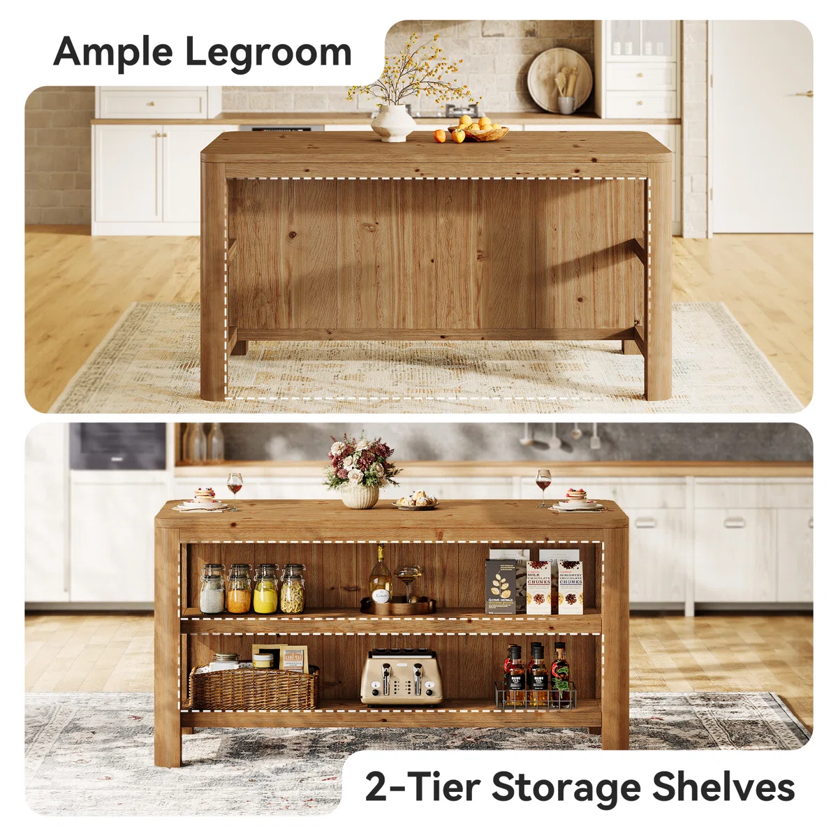 - Dual-Sided Functionality: It’s a kitchen workhorse on one side and a cozy dining spot on the other. The front features two expansive open shelves to display your beautiful cookware, while the back offers a clean, recessed panel with plenty of legroom for seating.