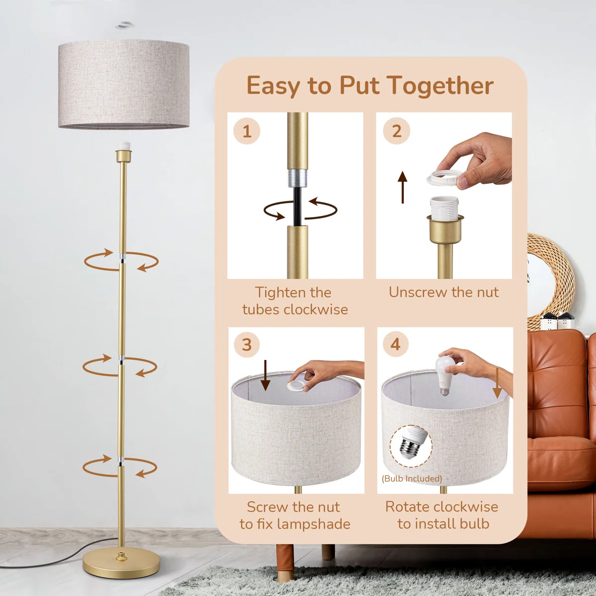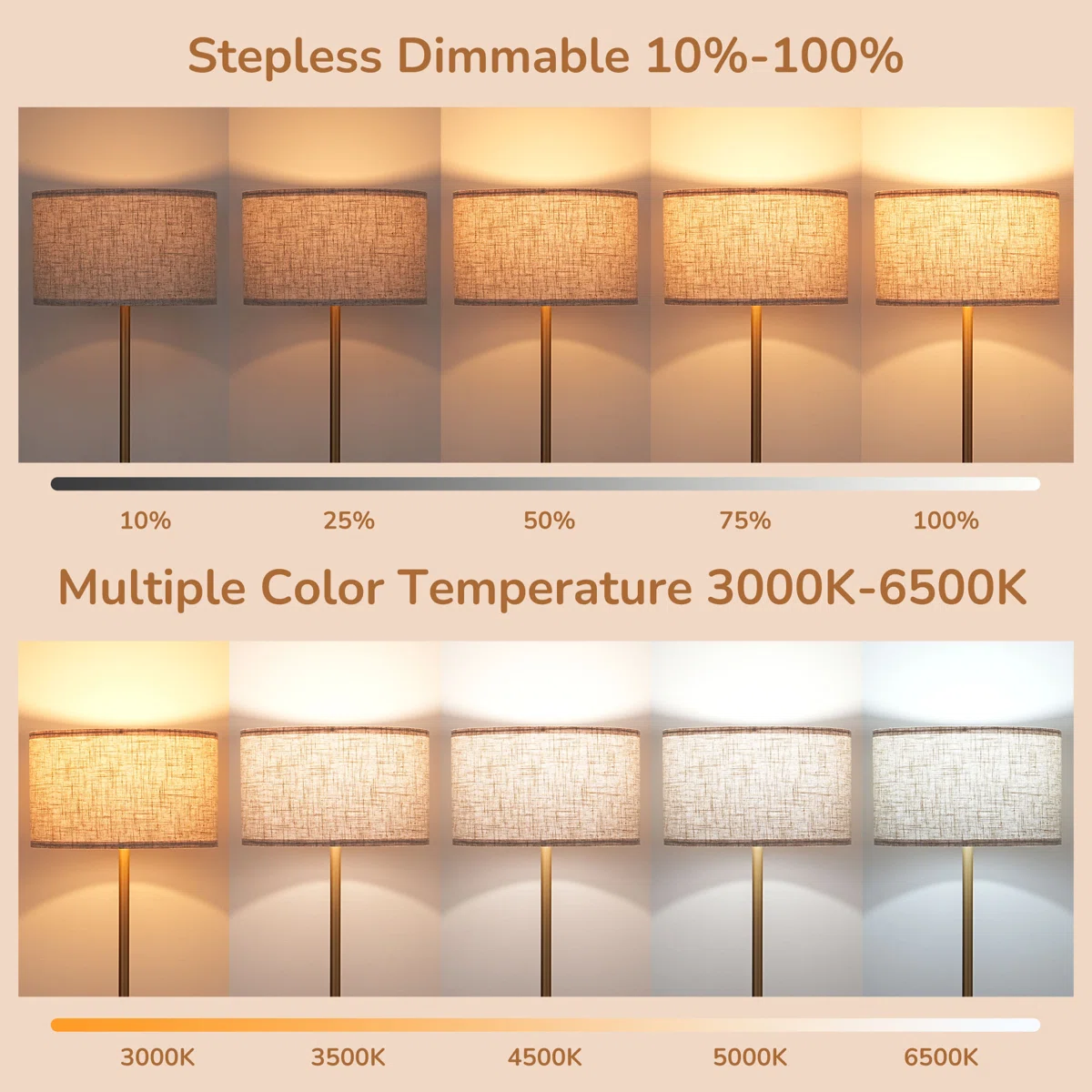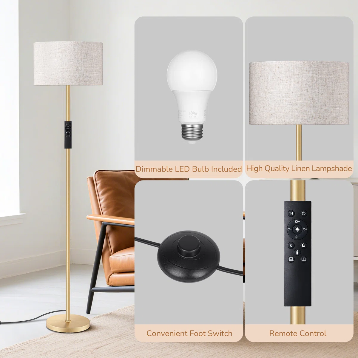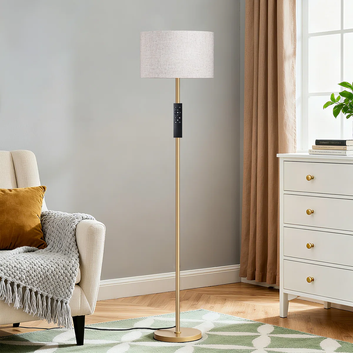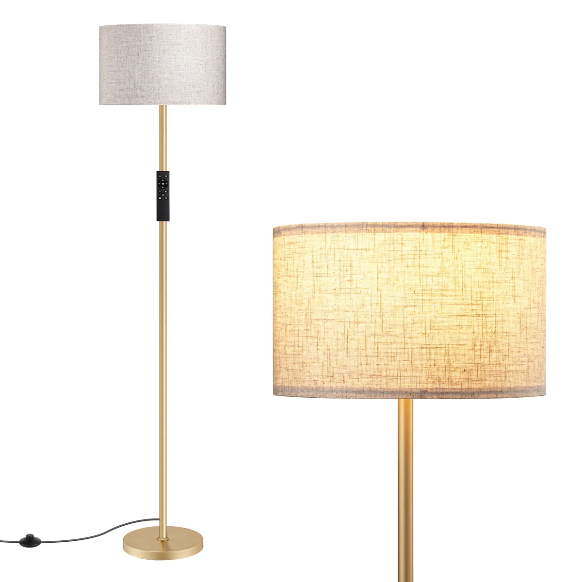 Elegant Brass Finish: Elevate your space with the sleek, straight-pole design finished in a sophisticated brushed brass, perfectly complemented by a classic linen drum shade. 🧲 Genius Magnetic Remote: Never lose your remote again! The included remote control magnetically attaches directly to the lamp pole for effortless access and a clutter-free look. 💡 Smart Lighting Included: Comes with a 10W LED bulb featuring stepless dimming (10%-100%) and adjustable color temperatures (3000K-6500K) to create your ideal atmosphere. 🛠️ Tool-Free Assembly: Designed for ultimate convenience, this lamp can be easily screwed together by hand in under 5 minutes—no tools required.